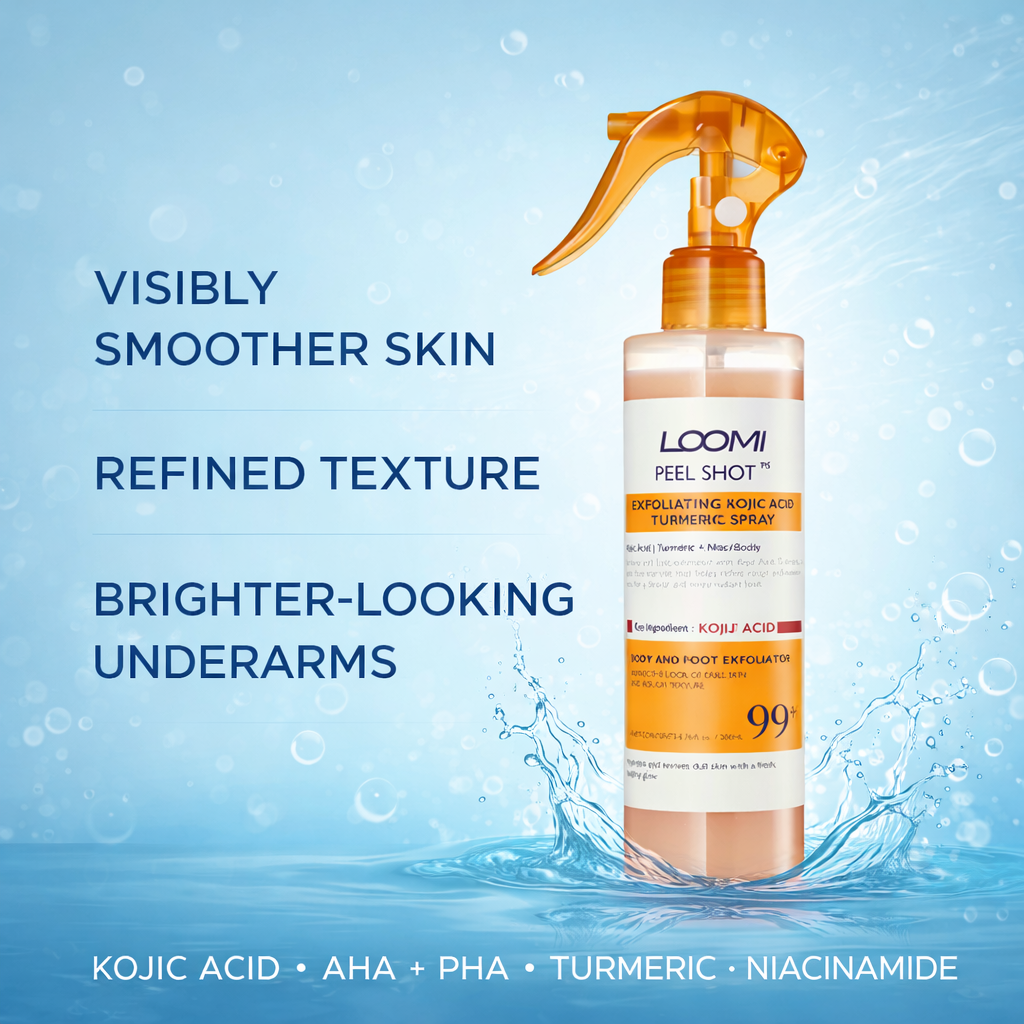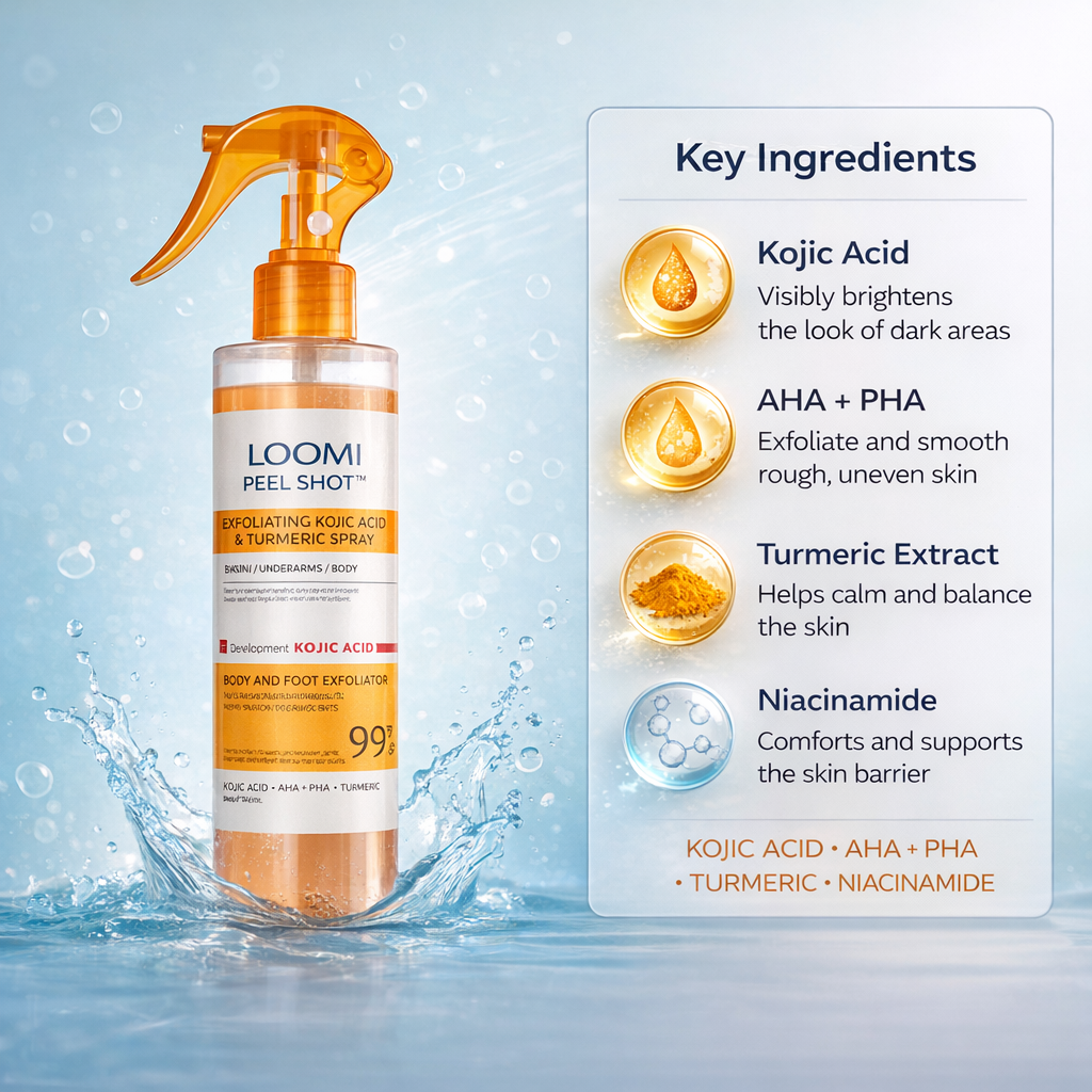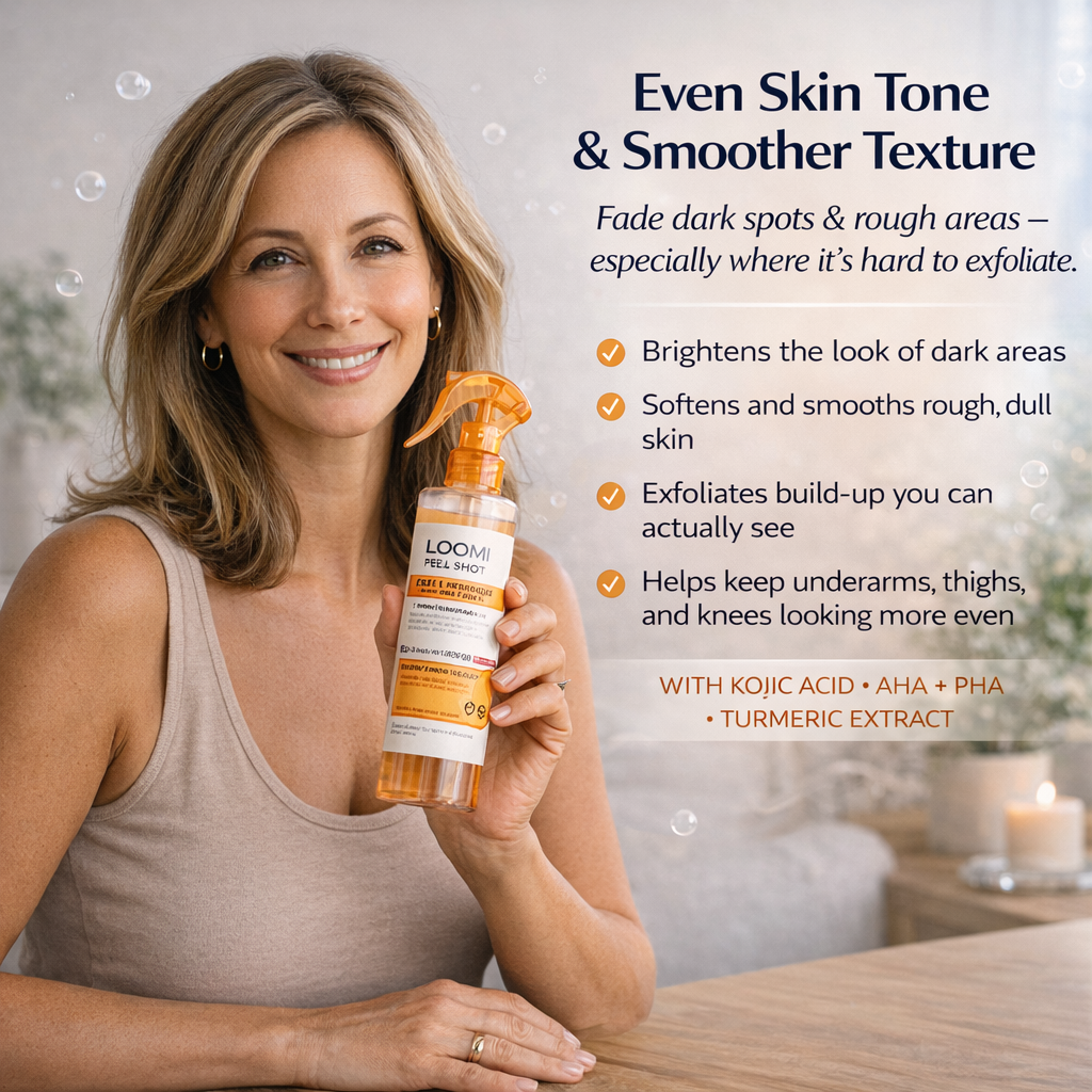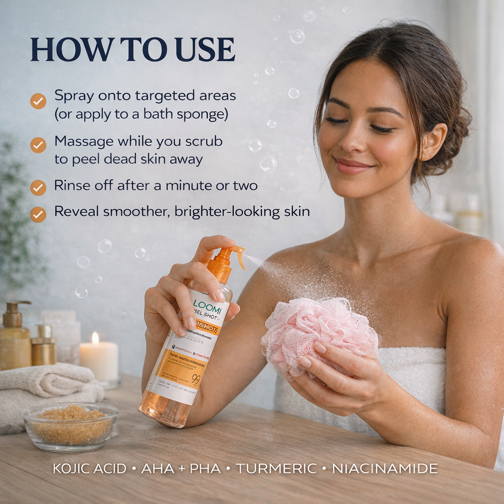 Loomi – Peel Shot is a targeted, body-grade peeling formula designed to visibly lift dead skin buildup, refine rough texture, and brighten dark areas — without harsh scrubs, aggressive acids, or surface-level fixes.