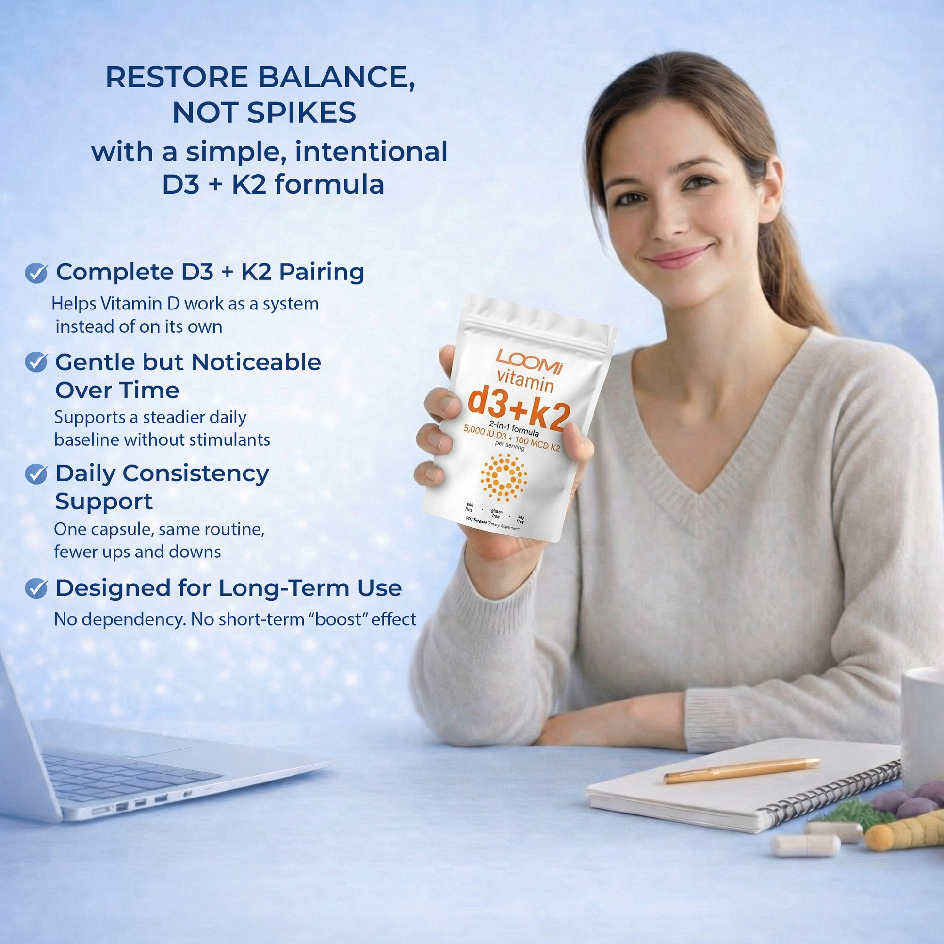 This is one of the most common reasons people choose Loomi™. Many Vitamin D supplements contain D3 alone, which helps with calcium absorption but doesn’t always tell the body where to place it. Loomi™ pairs Vitamin D3 with Vitamin K2, which is why many customers say it feels more complete and consistent over time. Instead of expecting an immediate “boost,” most people notice things feel steadier after taking it daily for a few weeks.